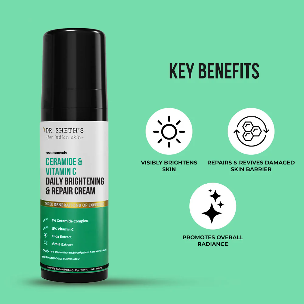 Only Brighter Skin Days Ahead! Dr Sheth’s Ceramide & Vitamin C Daily Brightening & Repair Cream is a lightweight, non-sticky daily-use formula that deeply moisturizes while targeting common skin concerns like dullness & damaged barrier. Strengthening ingredients such as Ceramide & Cica Extract completely reverse damage & restore a weak barrier while powerful antioxidants like Vitamin C & Amla Extract even skin tone & boost radiance!